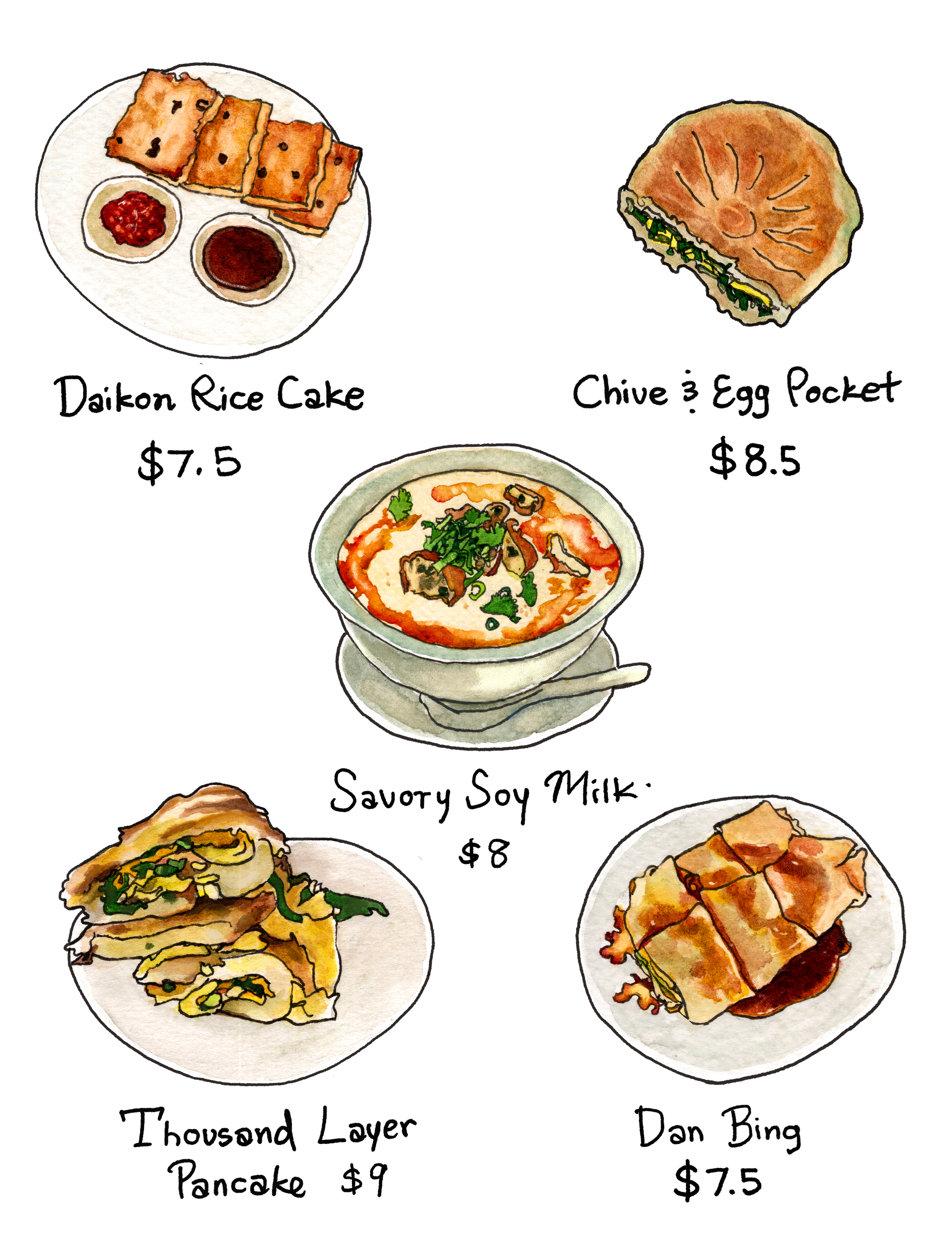 The breakfast menu offers long-time Pine & Crane classics like Pan Fried Pork Buns and Thousand Layer Pancakes, alongside new dishes like the Dan Bing, an egg-crepe combo with garlic-like soy sauce and simpler dishes like the Fan Tuan, Daikon Rice Cakes and Chive and Egg pocket.